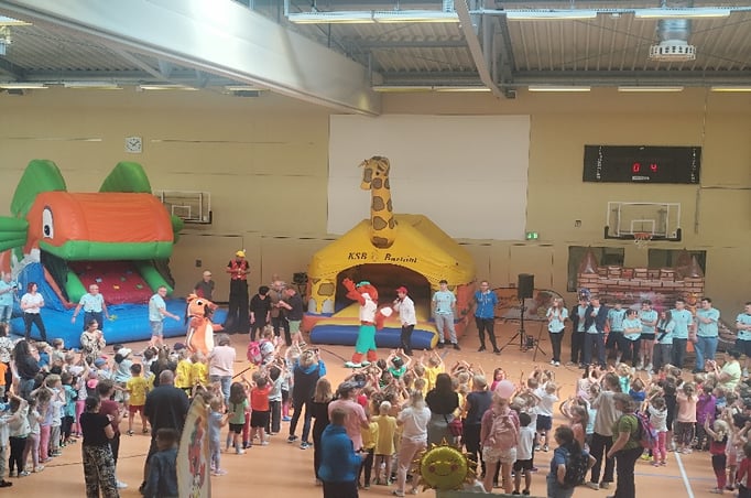 In der Zeit von 10 Uhr bis 13 Uhr hatten wir hier viel Spaß, ob auf den großen Hüpfburgen, beim Kräftemessen am Tau, dem Glücksrad und noch vielem mehr. Natürlich gehört zum Wettkampf auch eine Medaille die sich alle erkämpft haben. Mit dabei war natürlich auch das Maskottchen „Barnike“ der Fuchs. Köstlich versorgt mit einem Lunchpaket und einem leckeren Eis ging es dann zum Abschluss mit Tanz und Spielspaß zu Max und Tini.